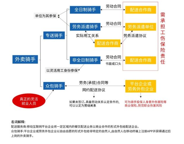 (七)“众包骑手”是与“平台企业”或其“劳务外包企业”签订网约配送员协议的“外卖骑手”,属于灵活就业人员,其与“平台企业”或“劳务外包企业”建立劳务、承揽等法律关系,不存在劳动关系、非全日制用工关系和实际用工关系。
