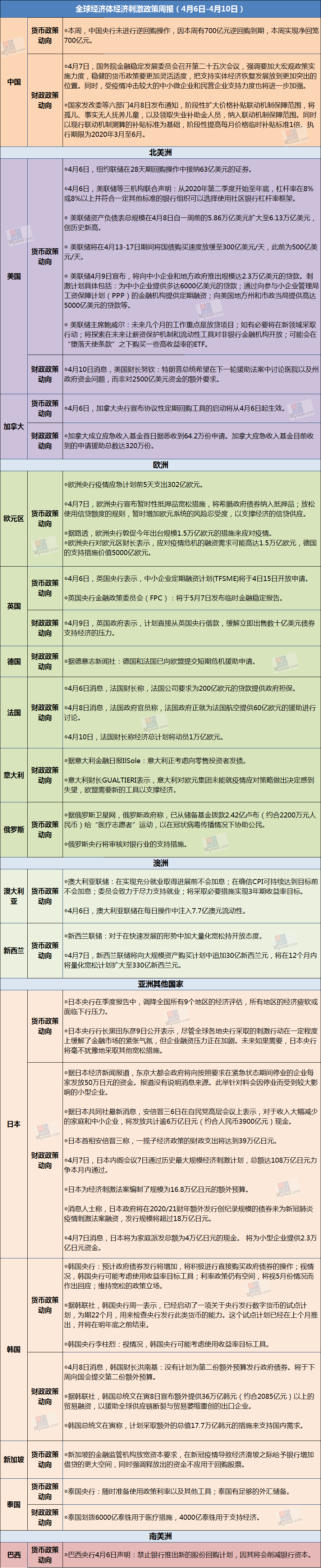 全球经济体经济刺激政策周报(4月6日-4月10日)