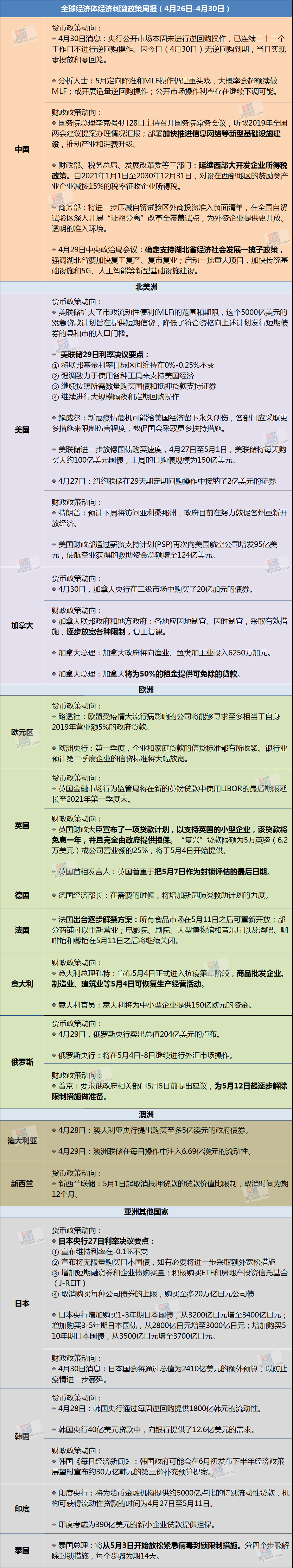 全球经济体经济刺激政策周报(4月20日-4月24日)