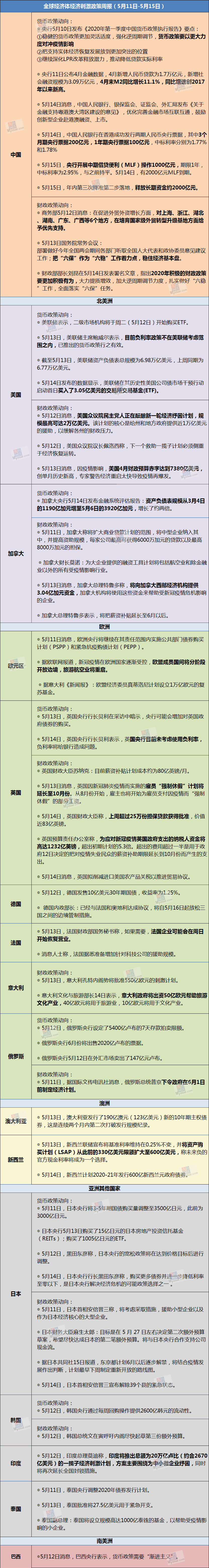 全球经济体经济刺激政策周报(5月11日-5月15日)