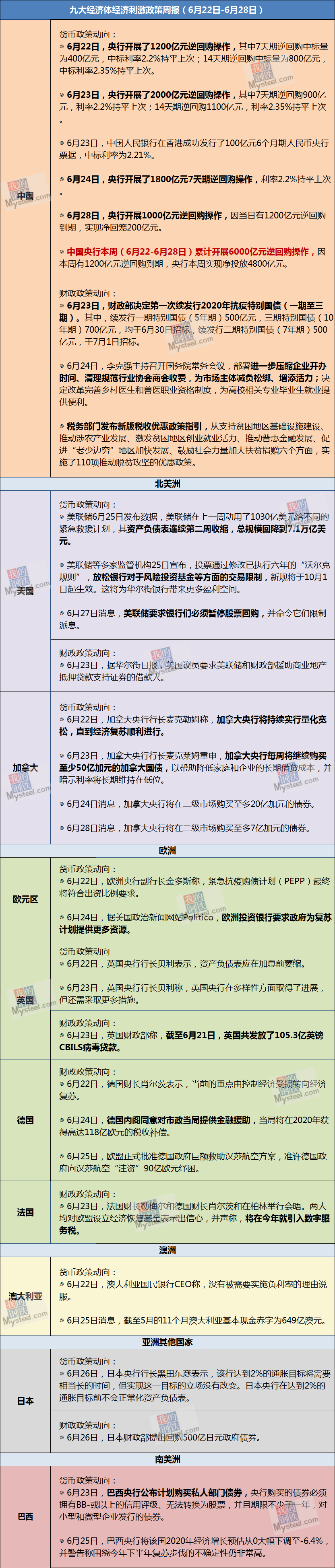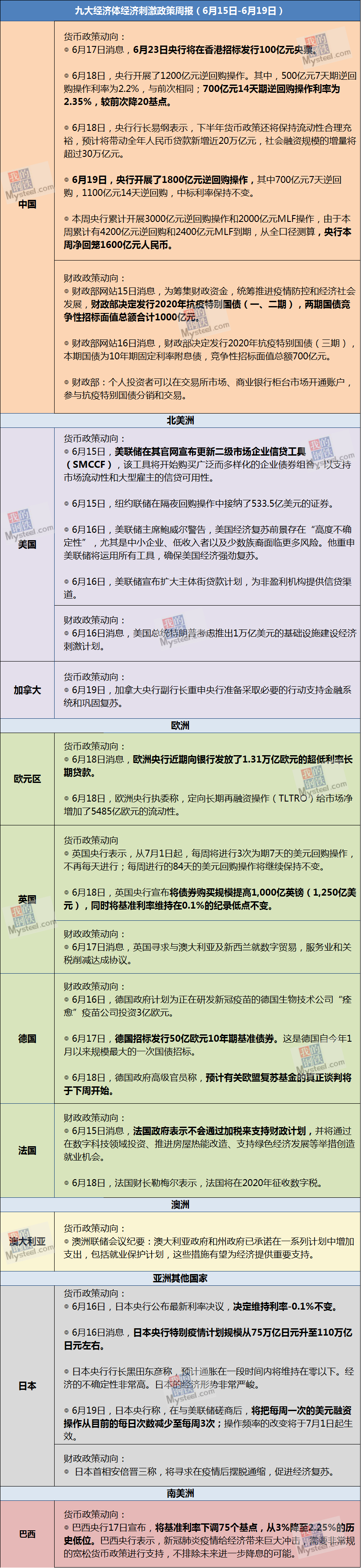 Mysteel不完全汇总了本周(6月1日-6月5日)全球13个经济体实施经济刺激的政策,具体如下: